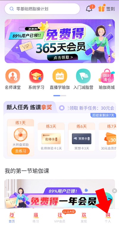 1、在本站下载并安装每日瑜伽,来到主界面后,点击右下角的个人选项